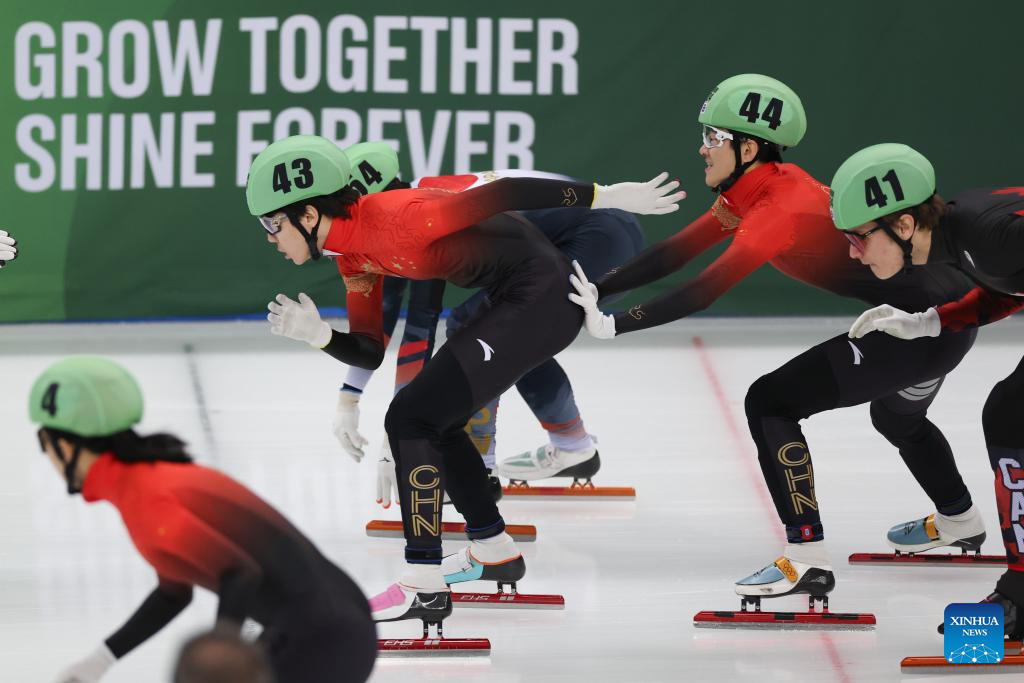 Yang Jingru (C) of team China competes during the mixed team relay final A of short track speed skating event at the Gangwon 2024 Winter Youth Olympic Games in Gangneung, South Korea, Jan. 24, 2024. (Xinhua/Xu Yanan)