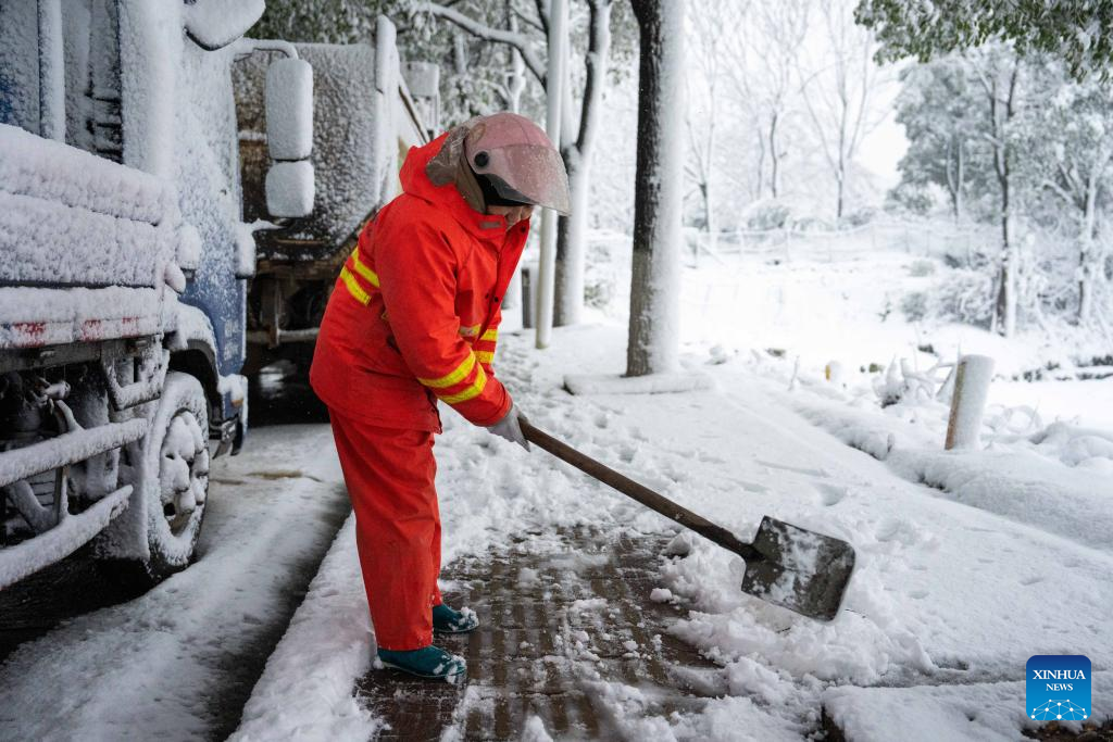 A sanitation worker cleans snow on the road in Changsha, central China's Hunan Province, Jan. 22, 2024. (Xinhua/Chen Sihan)