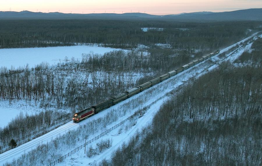 Train K7066 runs along the railway from Fuyuan to Harbin in northeast China's Heilongjiang Province, Jan. 23, 2024. (Xinhua/Wang Yuguo)
