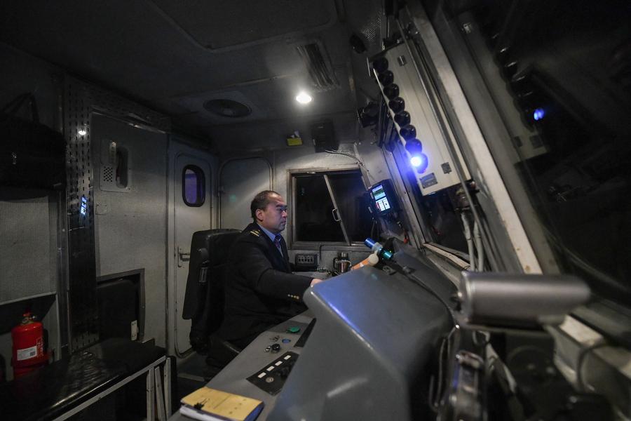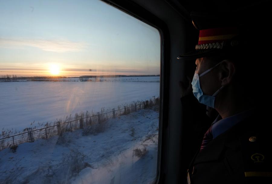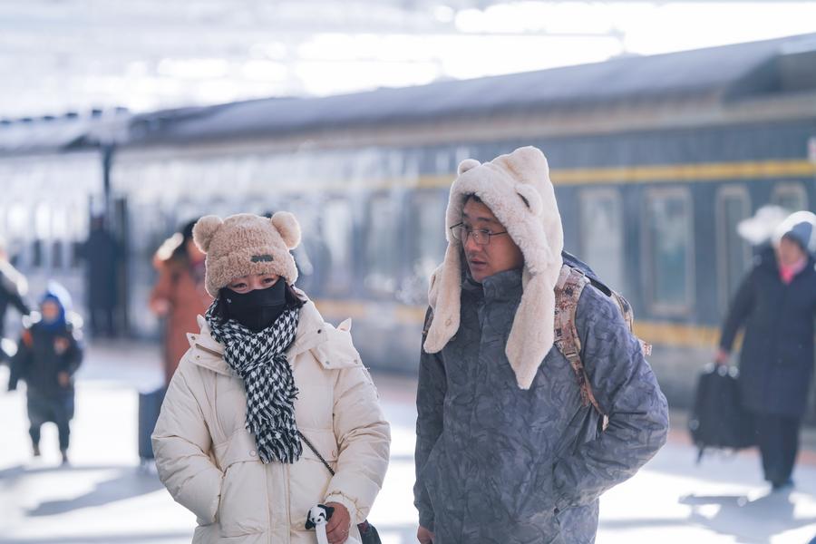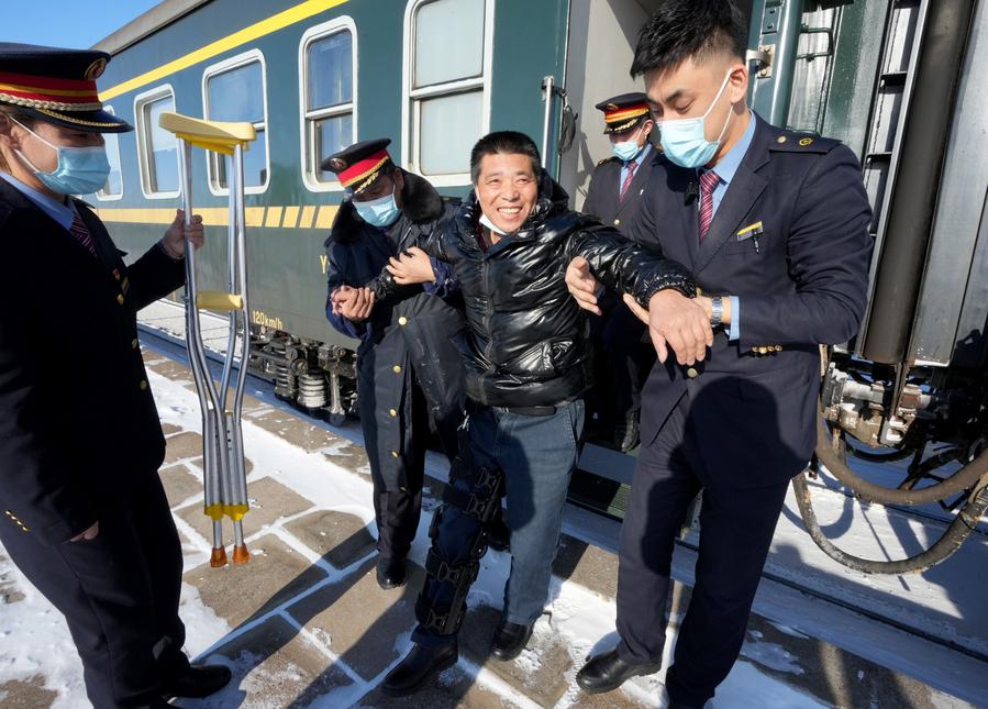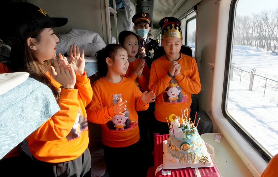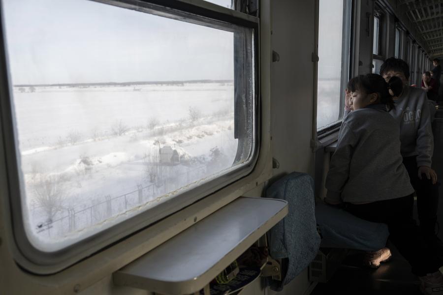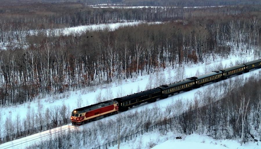 HARBIN, Jan. 25 (Xinhua) -- The train K7065/K7066 travels to and fro between the city of Harbin and Fuyuan in China's northeastern province of Heilongjiang. With a single journey time of nearly 15 hours, the train replaced old carriages with new ones having air conditioning system, offering a better travel experience for locals who visit friends or commute to work or study along the line.