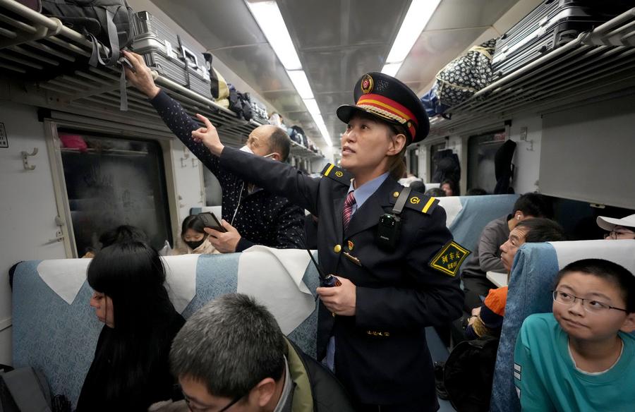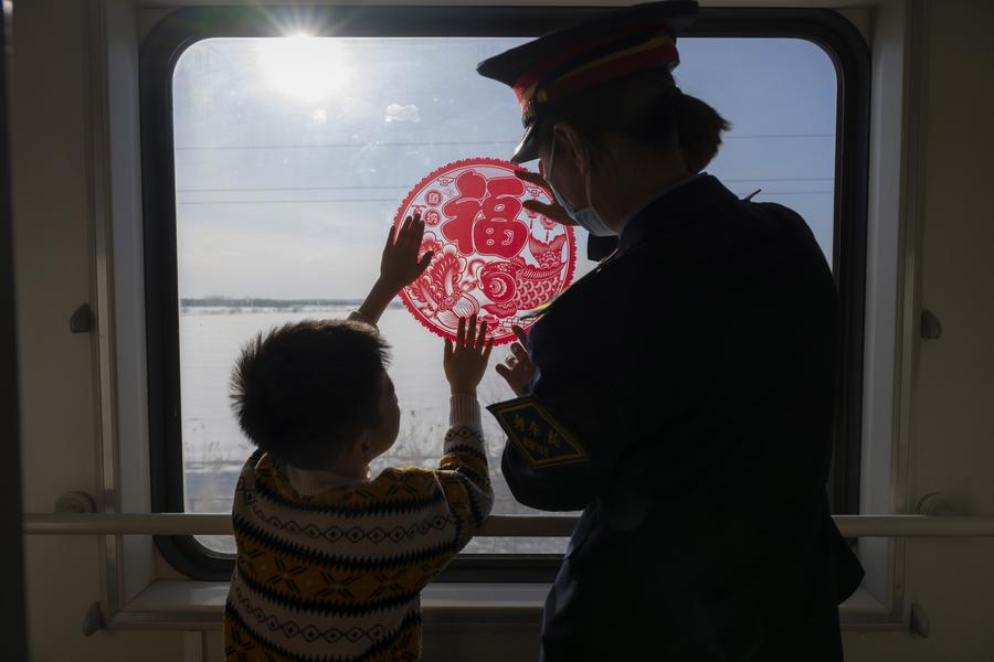 Driver Qiao Shuhai works at the cab of the train K7065 from Harbin to Fuyuan in northeast China's Heilongjiang Province, Jan. 23, 2024. (Xinhua/Wang Song)Train conductor Xu Dan conducts inspection work on the train K7065 from Harbin to Fuyuan in northeast China's Heilongjiang Province, Jan. 22, 2024. (Xinhua/Wang Yuguo)Train attendant Gong Xuedong inspects the generator set on the train K7065 from Harbin to Fuyuan in northeast China's Heilongjiang Province, Jan. 22, 2024. (Xinhua/Wang Yuguo)Train attendants help a man get off a train in Honghe railway station in Jiamusi, northeast China's Heilongjiang Province, Jan. 23, 2024. (Xinhua/Wang Yuguo)A train attendant and a child paste a paper-cut window decoration on the train K7065 from Harbin to Fuyuan in northeast China's Heilongjiang Province, Jan. 23, 2024. (Xinhua/Cai Yang)A train attendant watches the sunrise after working overnight on the train K7065 from Harbin to Fuyuan in northeast China's Heilongjiang Province, Jan. 23, 2024. (Xinhua/Wang Yuguo)A student celebrates his birthday on the train K7065 from Harbin to Fuyuan in northeast China's Heilongjiang Province, Jan. 23, 2024. (Xinhua/Wang Yuguo)Passengers ride the train K7065 from Harbin to Fuyuan in northeast China's Heilongjiang Province, Jan. 23, 2024. (Xinhua/Cai Yang)Passengers get off the train K7065 from Harbin to Fuyuan after arriving in Fuyuan, northeast China's Heilongjiang Province, Jan. 23, 2024. (Xinhua/Wang Song)A screenshot taken from an aerial video shows the train K7066 running along the railway from Fuyuan to Harbin in northeast China's Heilongjiang Province, Jan. 23, 2024. (Xinhua/Cai Yang)■
