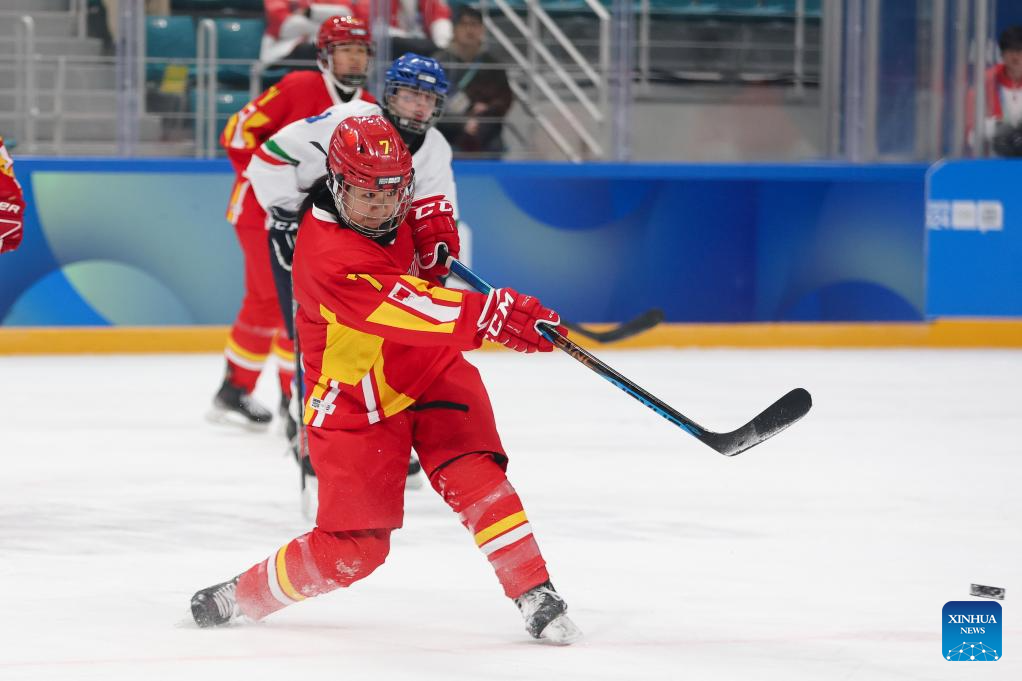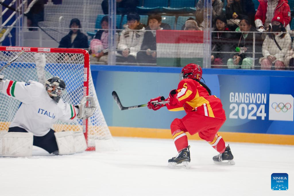 Li Xinyi of China shoots during the Women's 3-on-3 Tournament Bronze Medal Game of ice hockey event between China and Italy at the Gangwon 2024 Winter Youth Olympic Games in Gangneung, South Korea, Jan. 25, 2024. (Xinhua/Xu Yanan)