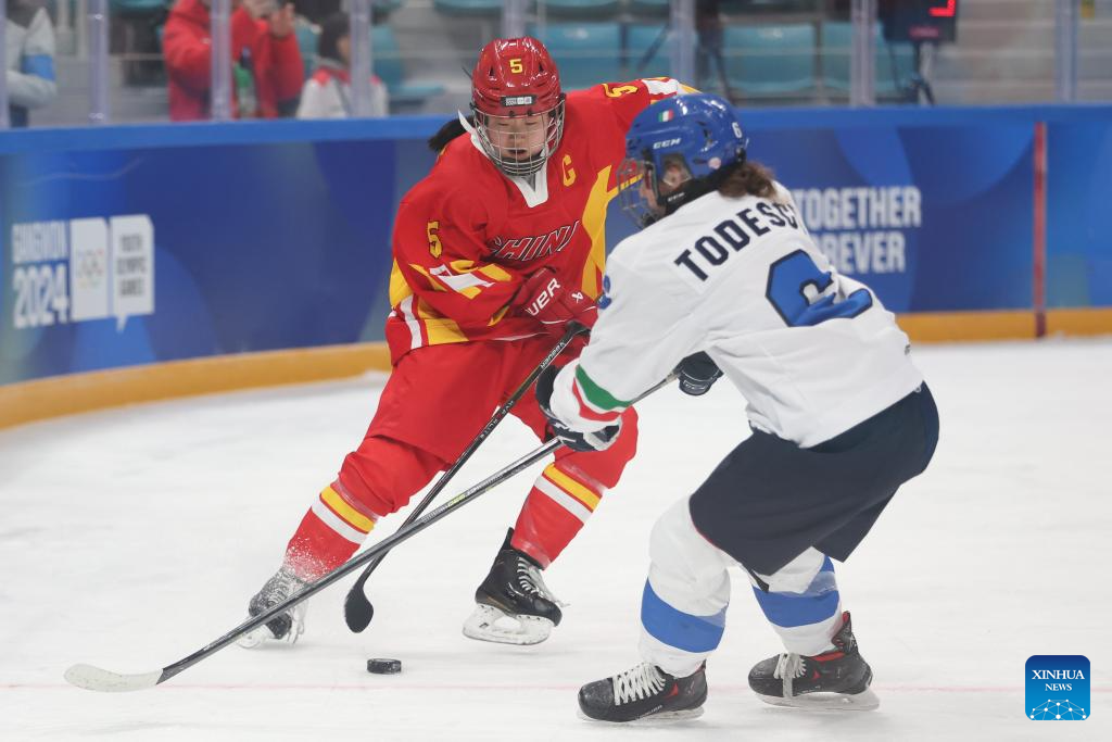 Zhang Anna (L) of China vies with Giorgia Todesco of Italy during the Women's 3-on-3 Tournament Bronze Medal Game of ice hockey event between China and Italy at the Gangwon 2024 Winter Youth Olympic Games in Gangneung, South Korea, Jan. 25, 2024. (Xinhua/Xu Yanan)