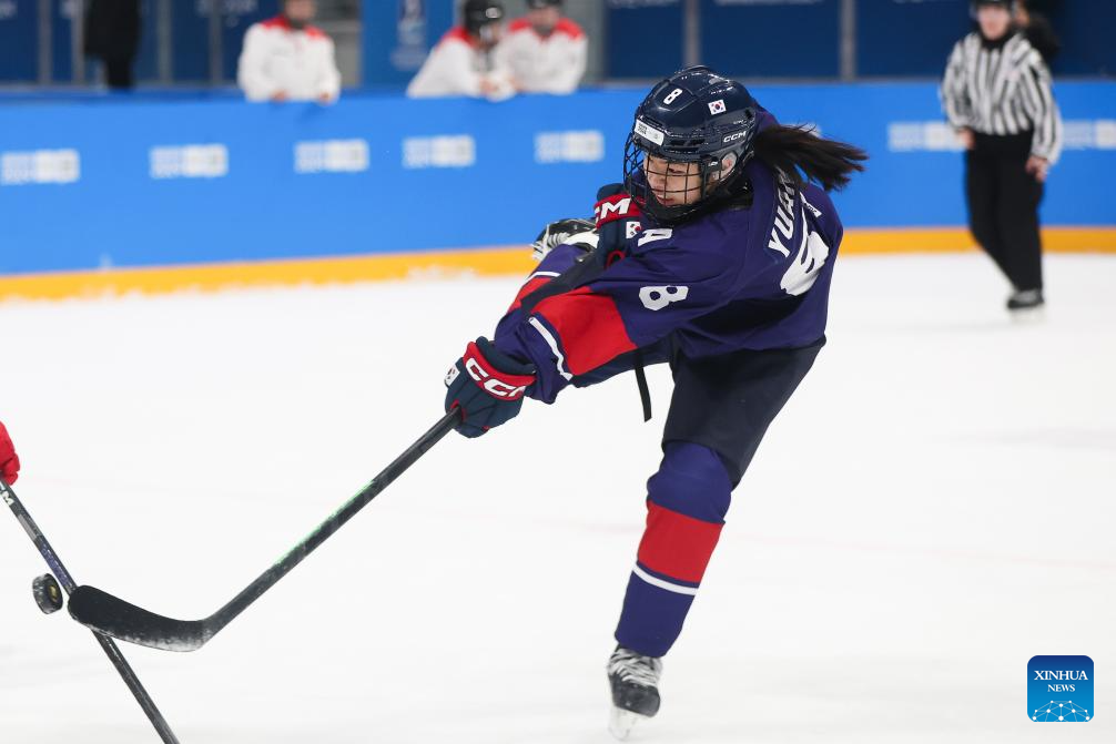 Han Yuan of South Korea shoots during the Women's 3-on-3 Tournament Gold Medal Game of ice hockey event between Hungary and South Korea at the Gangwon 2024 Winter Youth Olympic Games in Gangneung, South Korea, Jan. 25, 2024. (Xinhua/Xu Yanan)