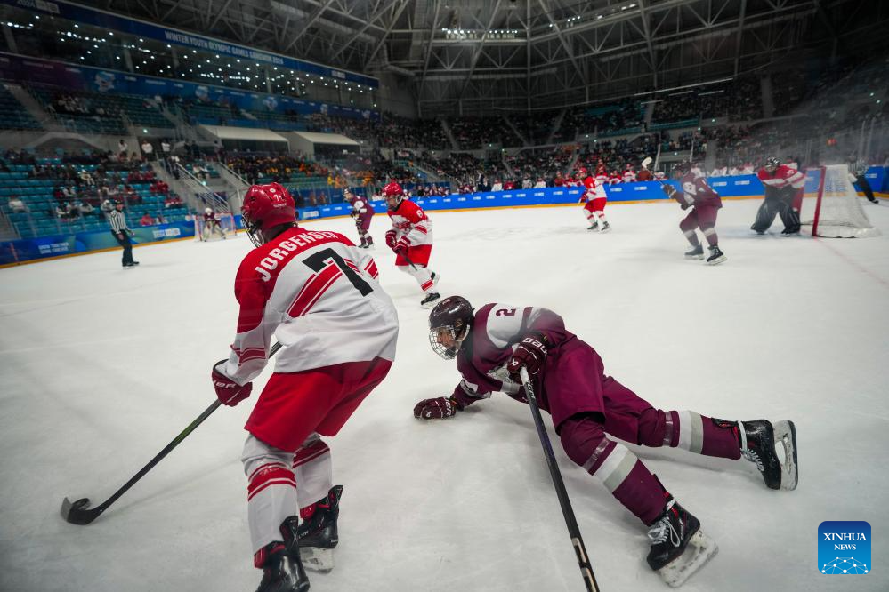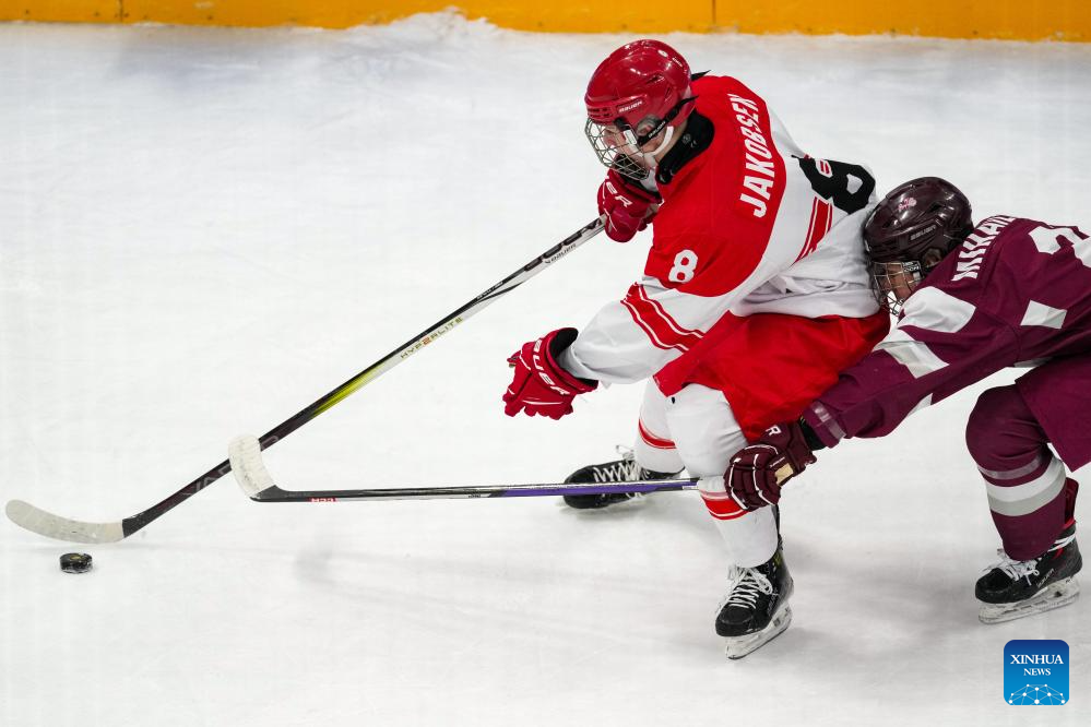 Andreas Klitaa Jorgensen (L) of Denmark competes during the men's 3-on-3 Tournament Gold Medal Game of ice hockey event between Latvia and Denmark at the Gangwon 2024 Winter Youth Olympic Games in Gangneung, South Korea, Jan. 25, 2024. (Xinhua/Zhang Xiaoyu)