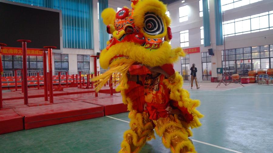 NANNING, Jan. 25 (Xinhua) -- At the stadium of Tengxian Technical Secondary School in south China's Guangxi Zhuang Autonomous Region, paper-mache lion heads swayed to rhythmic drums as a group of youths in yellow and red uniforms briskly strolled past the court, concluding their morning practice.