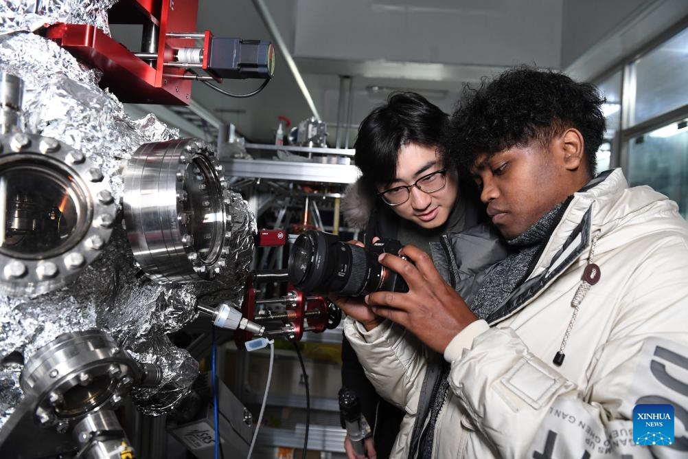 Yang Yuanfan (L) and an international student from Madagascar create a scientific visualization product at University of Science and Technology of China in Hefei, east China's Anhui Province, Dec. 29, 2023.