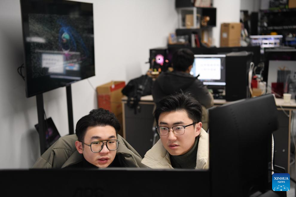 Yang Yuanfan (R) communicates with a member of his company in Hefei, east China's Anhui Province, Jan. 18, 2024.
