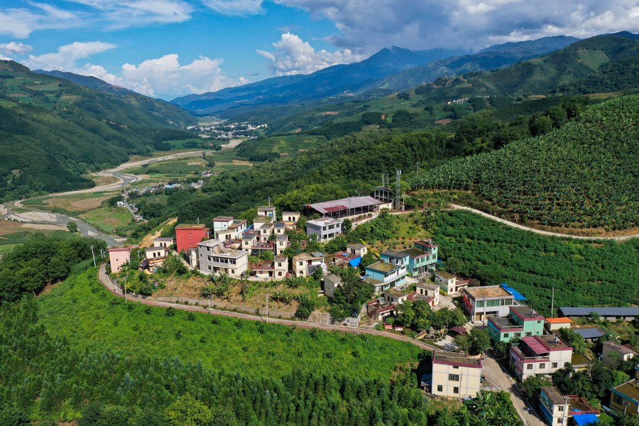 This aerial photo taken on July 23, 2023 shows a view of a relocation site for Kucong people in Zhemi Township, Jinping County, Honghe Hani and Yi Autonomous Prefecture, southwest China's Yunnan Province. (Xinhua/Chen Xinbo)