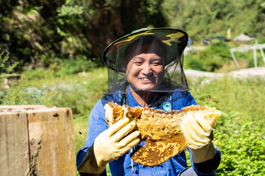 A man collects honey at Shibadong Village in Xiangxi Tujia and Miao Autonomous Prefecture, central China's Hunan Province, Nov. 1, 2023. (Xinhua/Chen Sihan)