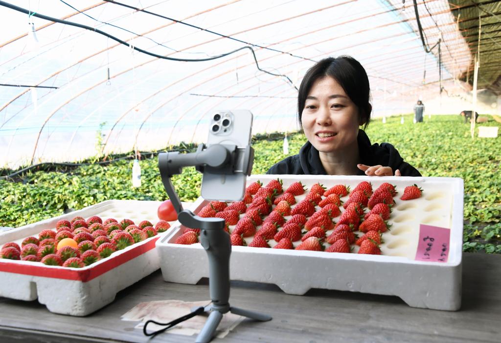 A staff member promotes strawberries via livestreaming at a greenhouse in Pinggu District of Beijing, capital of China, on Jan. 25, 2024. (Xinhua/Ren Chao)