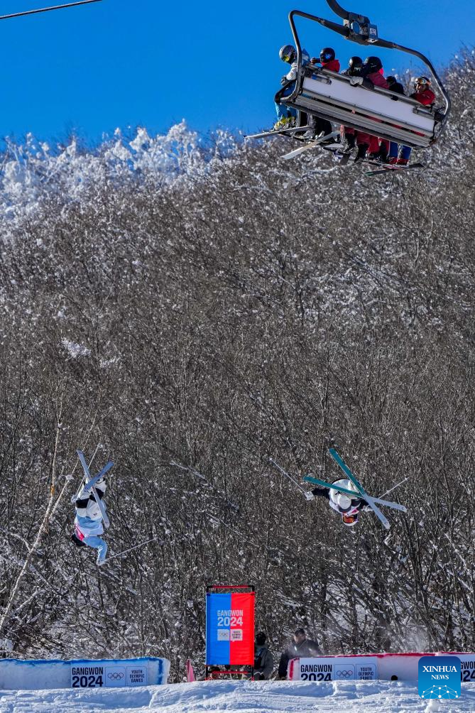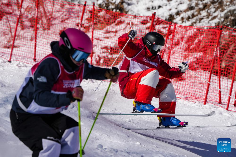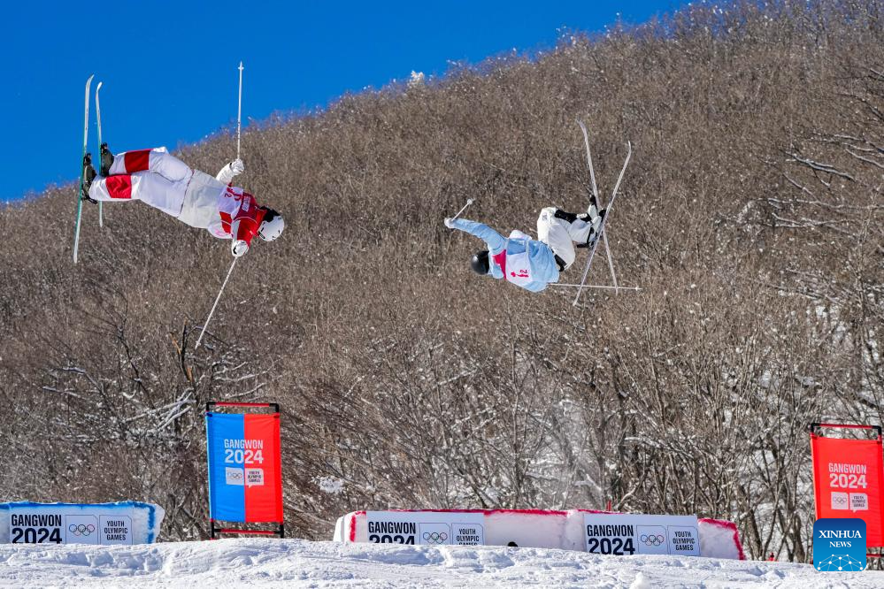 Li Ruilin (R) of China competes during the 1/8 Final of the Mixed Team Dual Moguls of Freestyle Skiing at the Gangwon 2024 Winter Youth Olympic Games in Jeongseon, South Korea, Jan. 26, 2024. (Xinhua/Zhang Xiaoyu)