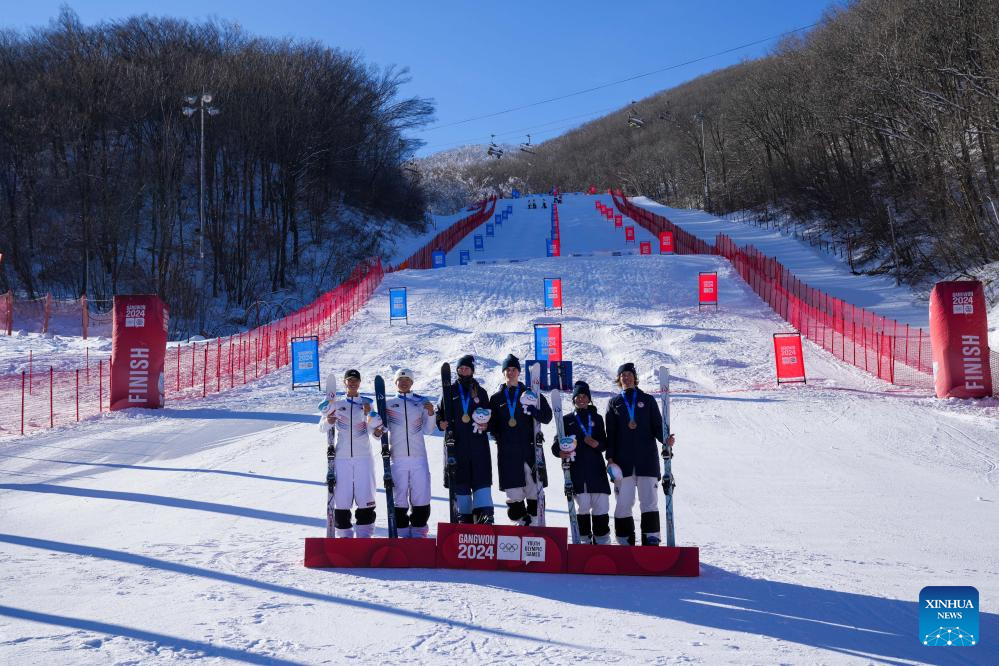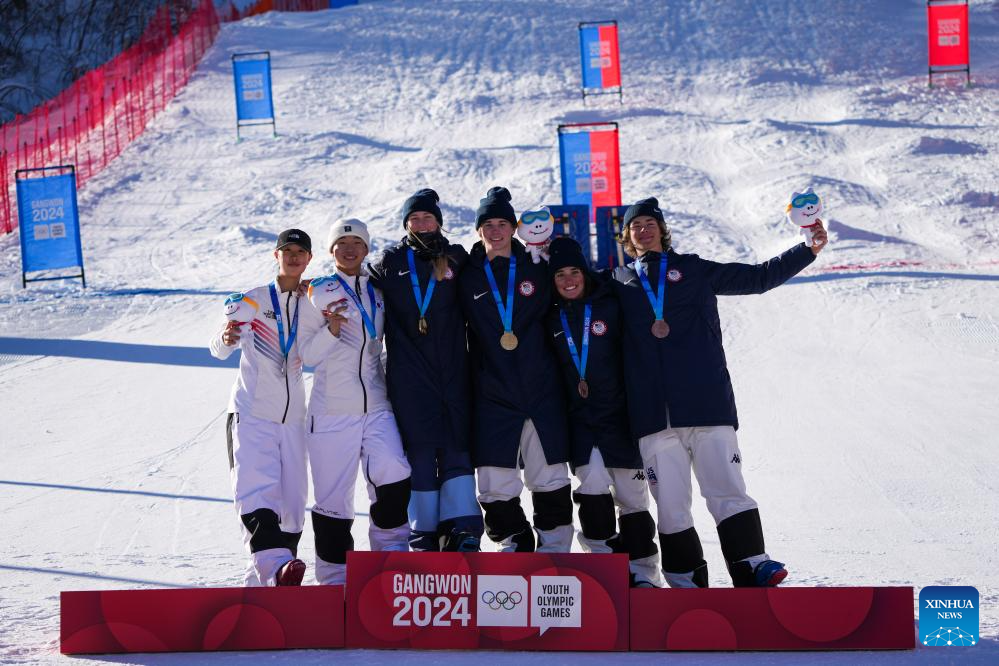 Gold medalists Elizabeth Lemley(3rd L) and Porter Huff (3rd R) of the United States, silver medalists Yun Shin-Ee (1st L) and Lee Yoon Seung (2nd L) of South Korea and bronze medalists Abby McLarnon (2nd R) and Jiah Cohen of the United States pose on the podium during the victory ceremony for the Mixed Team Dual Moguls of Freestyle Skiing at the Gangwon 2024 Winter Youth Olympic Games in Jeongseon, South Korea, Jan. 26, 2024. (Xinhua/Zhang Xiaoyu)