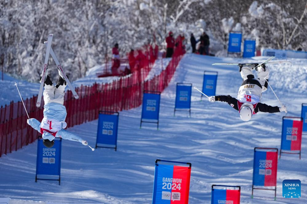 Porter Huff (L) of the United States competes with Nakamura Takuto of Japan during the Semifinal of the Mixed Team Dual Moguls of Freestyle Skiing at the Gangwon 2024 Winter Youth Olympic Games in Jeongseon, South Korea, Jan. 26, 2024. (Xinhua/Zhang Xiaoyu)