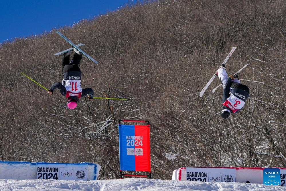 Yun Shin-Ee (R) of South Korea competes with Moon Seoyoung of South Korea during the Quarterfinal of the Mixed Team Dual Moguls of Freestyle Skiing at the Gangwon 2024 Winter Youth Olympic Games in Jeongseon, South Korea, Jan. 26, 2024. (Xinhua/Zhang Xiaoyu)