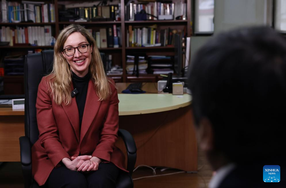 Nathalie de Gaulle, great-granddaughter of the former French President Charles de Gaulle, speaks during an interview with Xinhua in Paris, France, Jan. 8, 2024. (Xinhua/Gao Jing)