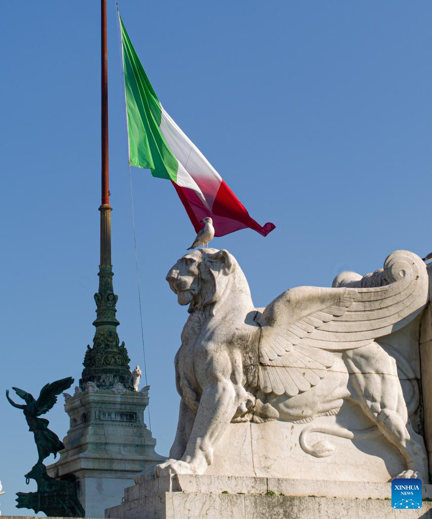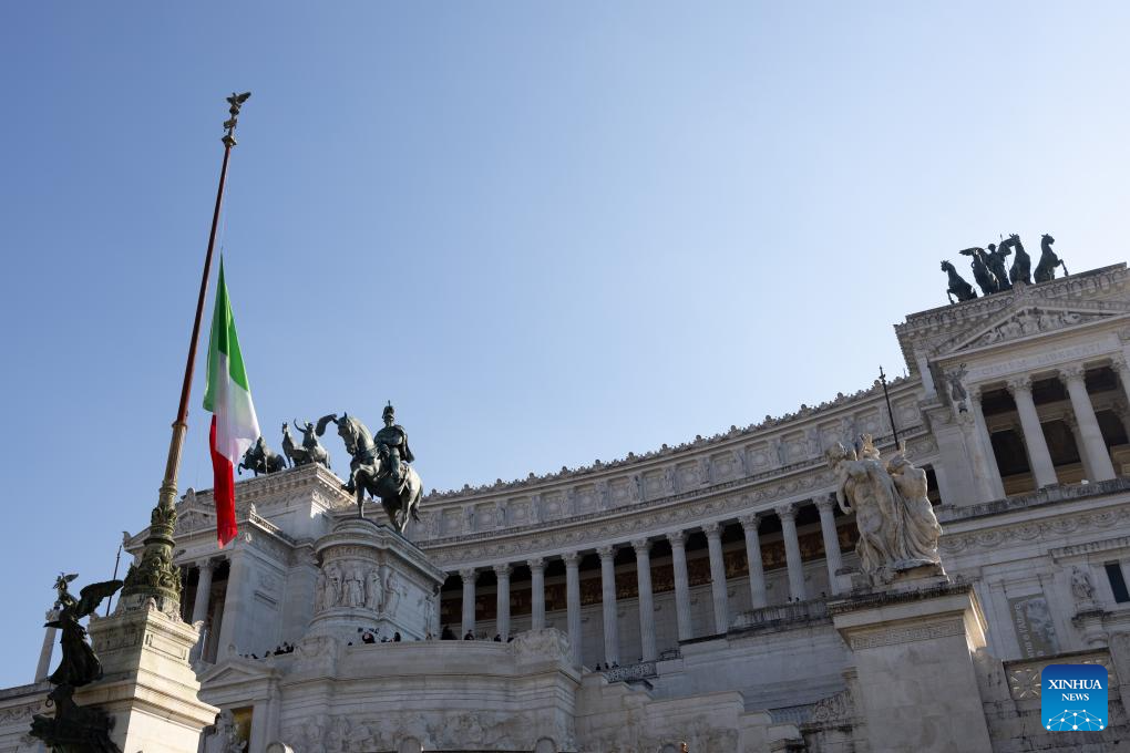 Italian national flag flies at half-mast on the Victor Emmanuel II National Monument in Rome, Italy, Jan. 27, 2024. In 2005, the UN General Assembly adopted a resolution which designated Jan. 27 as the International Day of Commemoration in Memory of the Victims of the Holocaust, the day when Auschwitz death camp was liberated in 1945. (Xinhua/Li Jing)