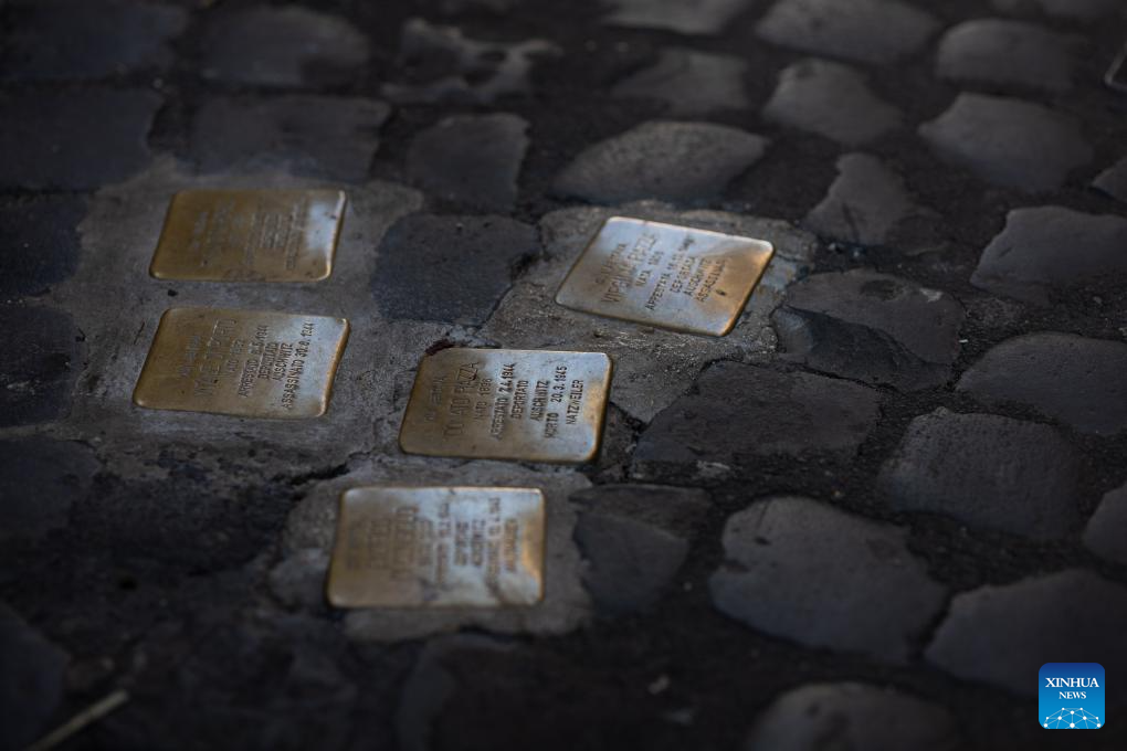 This photo taken on Jan. 27, 2024 shows "stumbling stones," which are small brass plaques engraved with names of Jews killed by the Nazis, at an alley in Rome, Italy. In 2005, the UN General Assembly adopted a resolution which designated Jan. 27 as the International Day of Commemoration in Memory of the Victims of the Holocaust, the day when Auschwitz death camp was liberated in 1945. (Xinhua/Li Jing)