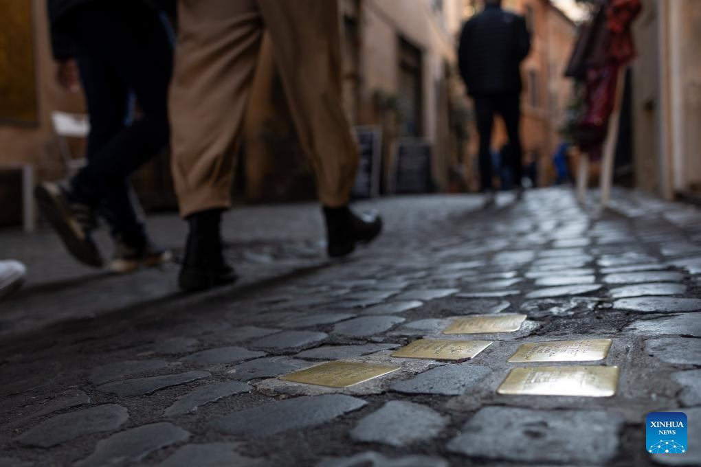 Tourists walk past "stumbling stones," which are small brass plaques engraved with names of Jews killed by the Nazis, at an alley in Rome, Italy, Jan. 27, 2024. In 2005, the UN General Assembly adopted a resolution which designated Jan. 27 as the International Day of Commemoration in Memory of the Victims of the Holocaust, the day when Auschwitz death camp was liberated in 1945. (Xinhua/Li Jing)