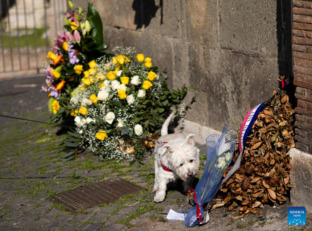 A dog sniffs the bouquets laid in memory of the Holocaust victims in Rome, Italy, Jan. 27, 2024. In 2005, the UN General Assembly adopted a resolution which designated Jan. 27 as the International Day of Commemoration in Memory of the Victims of the Holocaust, the day when Auschwitz death camp was liberated in 1945. (Xinhua/Li Jing)