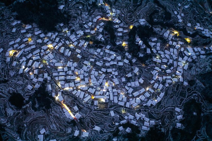 An aerial drone photo taken on Jan. 24, 2024 shows the night view of Jindong Village in Gandong Township of Rongshui Miao Autonomous County, south China's Guangxi Zhuang Autonomous Region. (Xinhua/Huang Xiaobang)