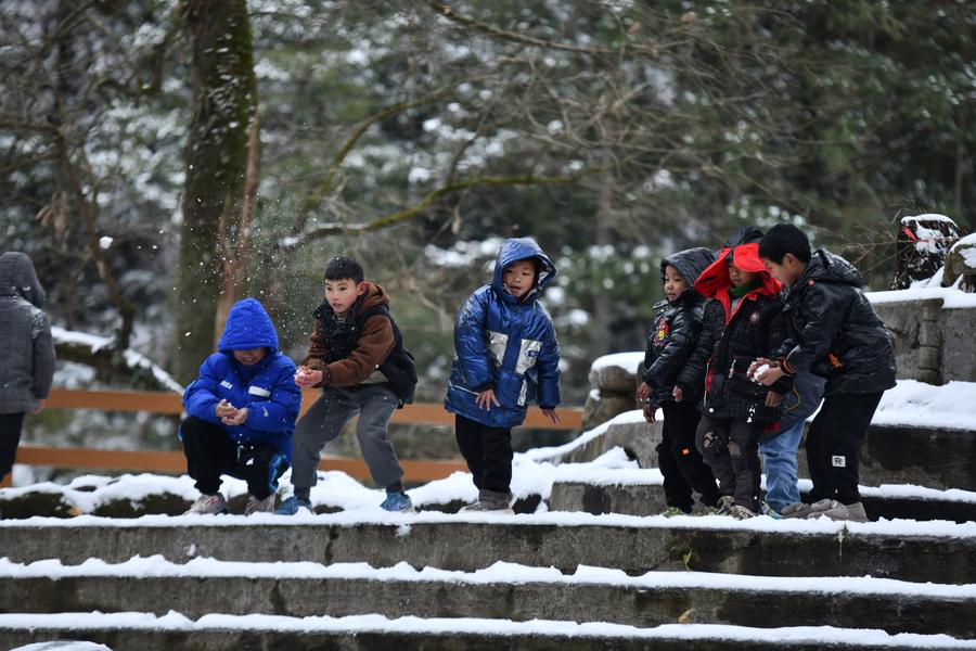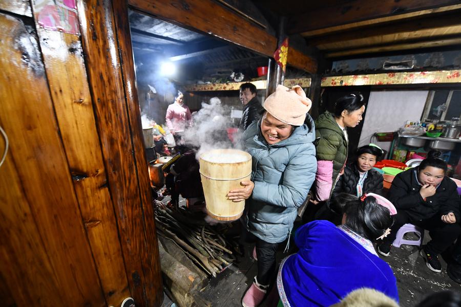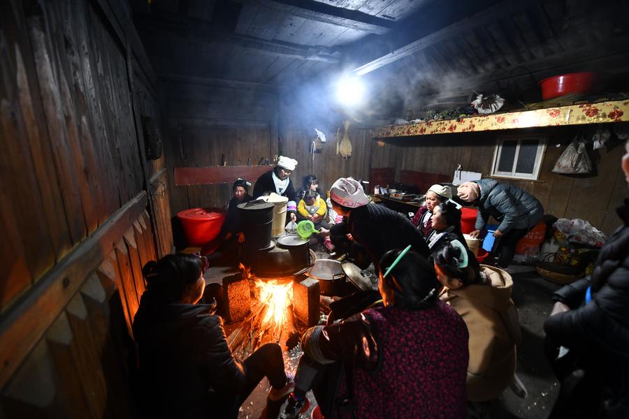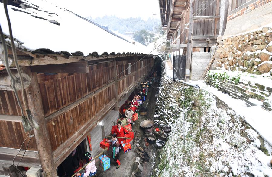 RONGSHUI, Jan. 27 (Xinhua) -- Miao ethnic people in high mountainous villages of Liuzhou are busy preparing celebratory merchandise, hosting feasts, and rehearsing festive events ahead of the upcoming Chinese New Year despite the freezing weather.