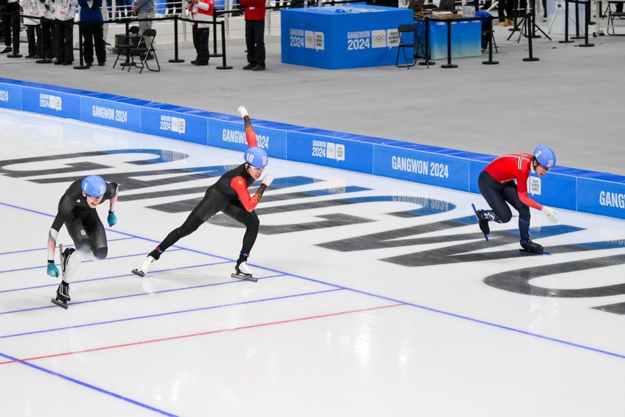 Germany's Finn Sonnekalb gained his third gold in the men's speed skating mass start after winning the 500m and 1,500m individual events.