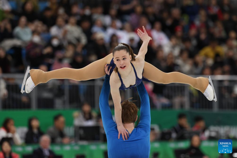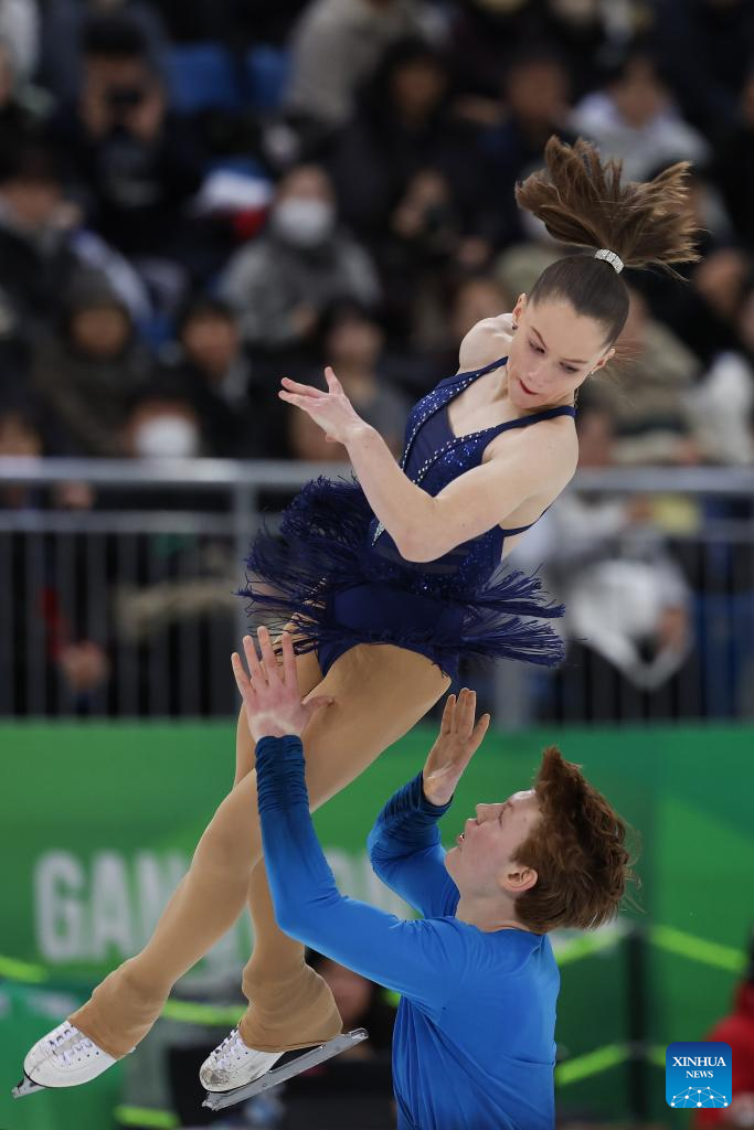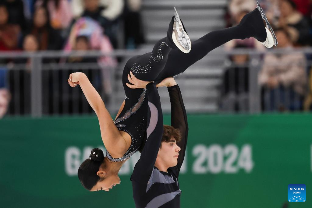 Cayla Smith (top) and Jared McPike of the United States perform during the pair skating short program of figure skating event at the Gangwon 2024 Winter Youth Olympic Games in Gangneung, South Korea, Jan. 27, 2024. (Xinhua/Xu Yanan)
