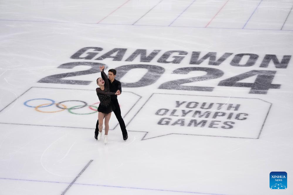 Carolina Shan Campillo (R) and Pau Vilella of Spain compete during the pair skating short program of figure skating event at the Gangwon 2024 Winter Youth Olympic Games in Gangneung, South Korea, Jan. 27, 2024. (Xinhua/Zhang Xiaoyu)