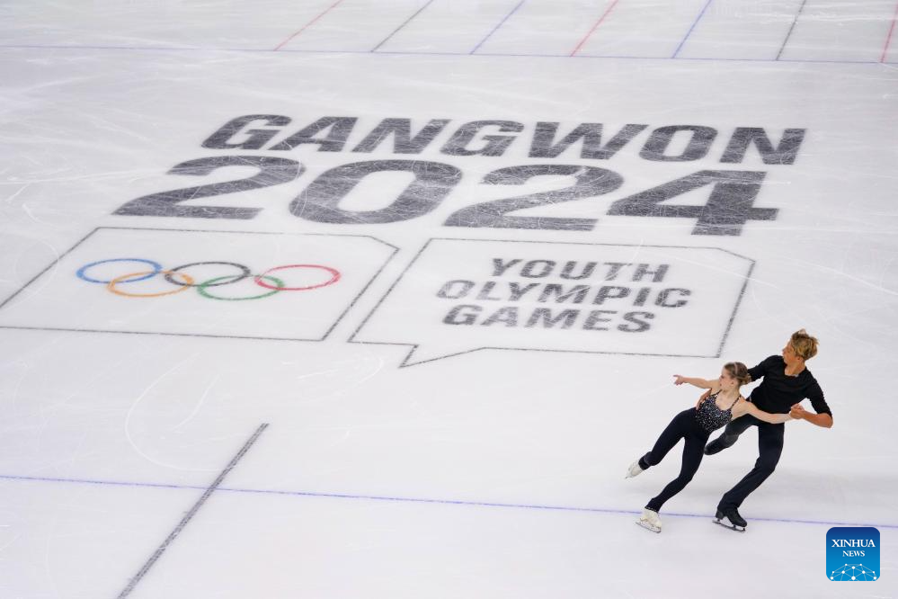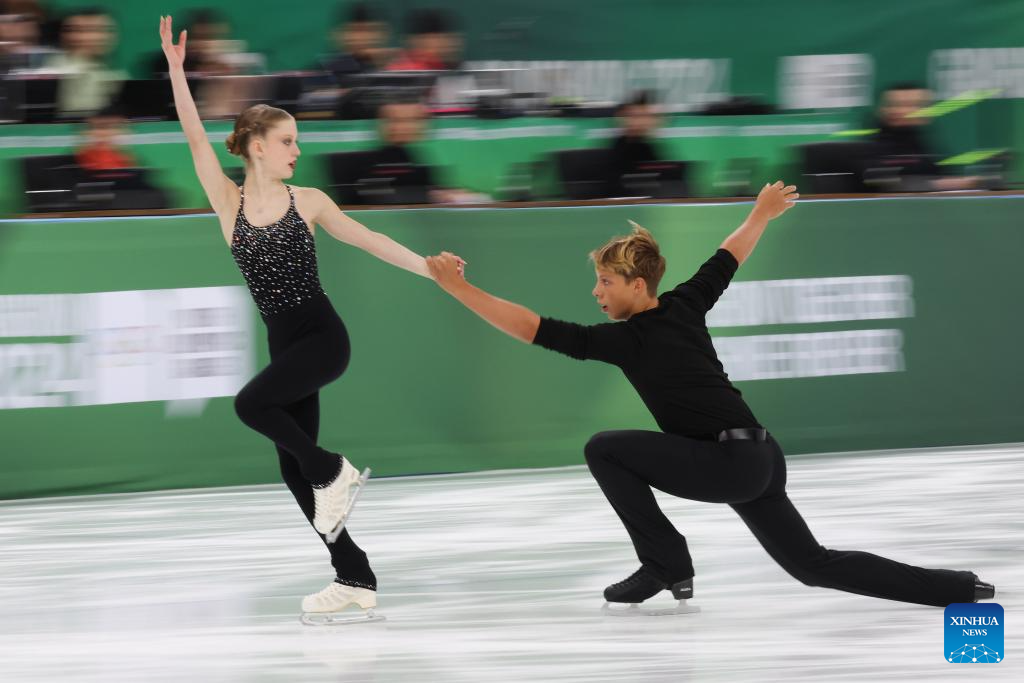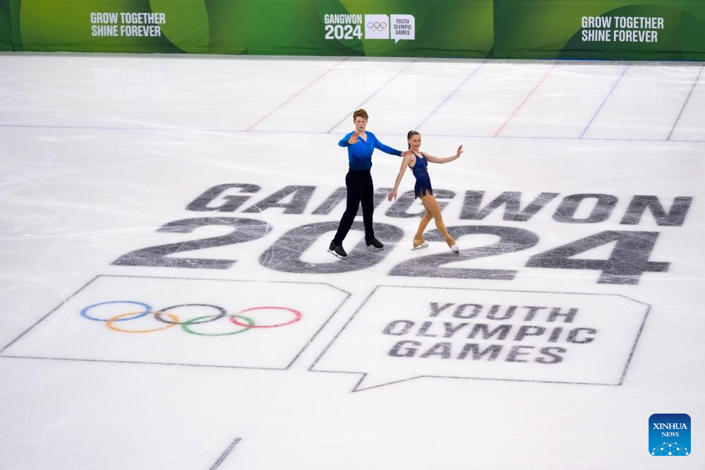 Annika Behnke (L) and Kole Sauve of Canada compete during the pair skating short program of figure skating event at the Gangwon 2024 Winter Youth Olympic Games in Gangneung, South Korea, Jan. 27, 2024. (Xinhua/Zhang Xiaoyu)