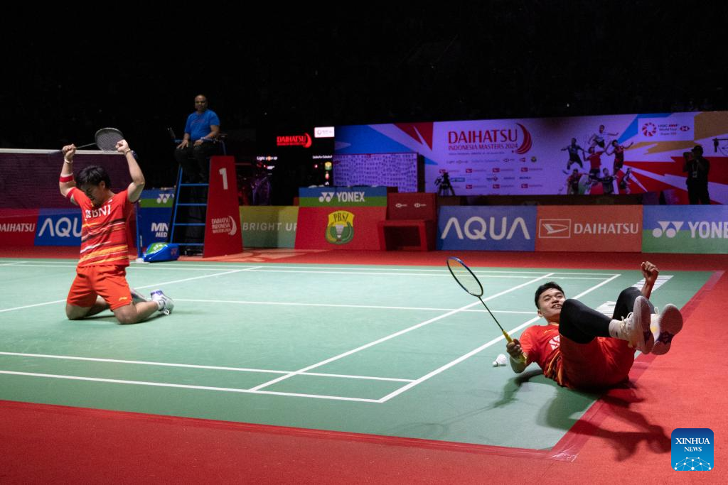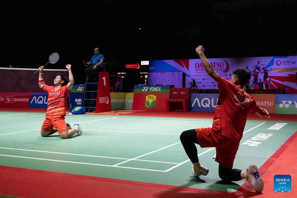 Leo Rolly Carnando (R)/Daniel Marthin celebrate after the men's doubles final between Indonesia's Leo Rolly Carnando/Daniel Marthin and Denmark's Kim Astrup/Anders Skaarup Rasmussen at 2024 Indonesia Masters badminton tournament in Jakarta, Indonesia, Jan. 28, 2024. (Xinhua/Veri Sanovri)