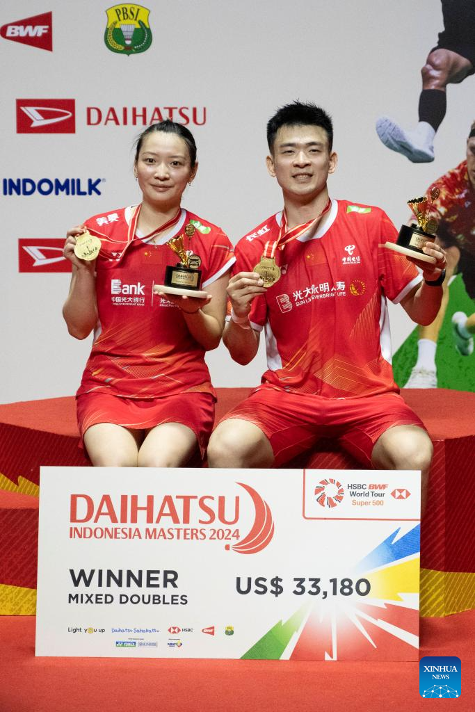 Zheng Siwei (R)/Huang Yaqiong pose during the awarding ceremony after the mixed doubles final between China's Zheng Siwei/Huang Yaqiong and Japan's Midorikawa Hiroki/Saito Natsu at 2024 Indonesia Masters badminton tournament in Jakarta, Indonesia, Jan. 28, 2024. (Xinhua/Veri Sanovri)