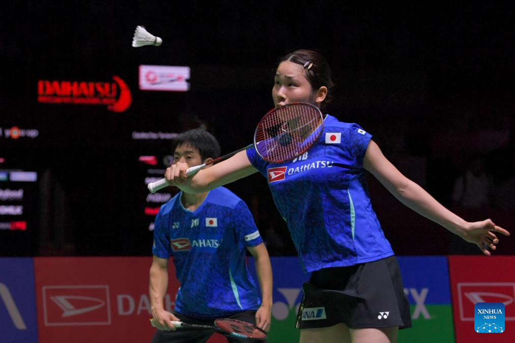 Midorikawa Hiroki/Saito Natsu (R) compete during the mixed doubles final between China's Zheng Siwei/Huang Yaqiong and Japan's Midorikawa Hiroki/Saito Natsu at 2024 Indonesia Masters badminton tournament in Jakarta, Indonesia, Jan. 28, 2024. (Xinhua/Xu Qin)