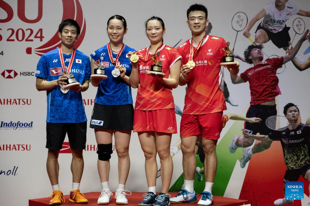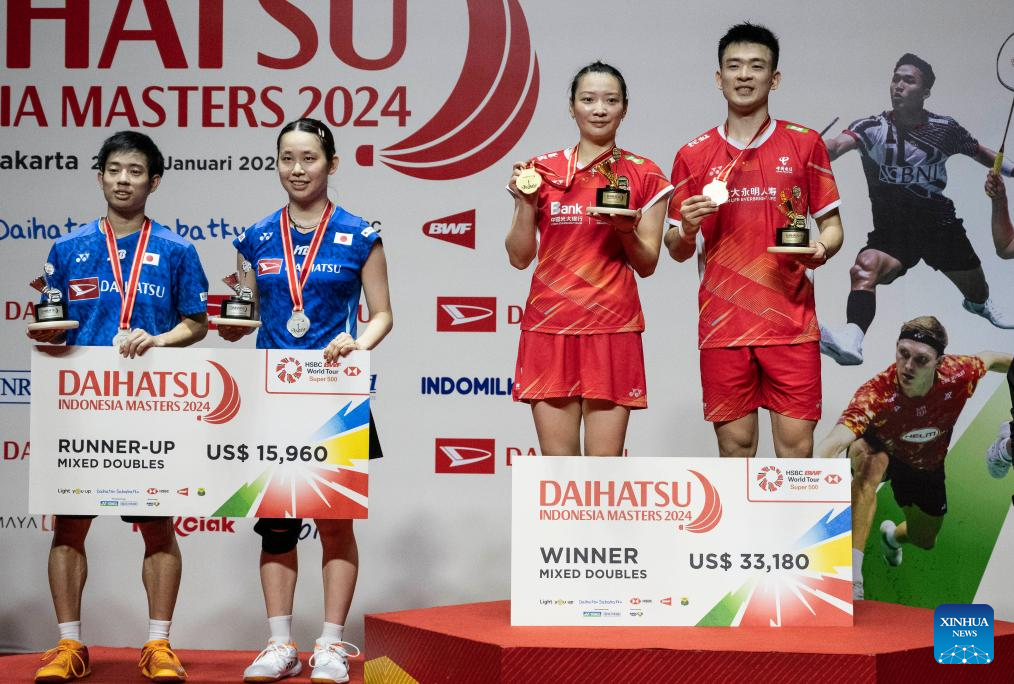 Zheng Siwei (1st R)/Huang Yaqiong (2nd R) of China and Midorikawa Hiroki/Saito Natsu (2nd L) of Japan attend the awarding ceremony after their mixed doubles final at 2024 Indonesia Masters badminton tournament in Jakarta, Indonesia, Jan. 28, 2024. (Xinhua/Veri Sanovri)