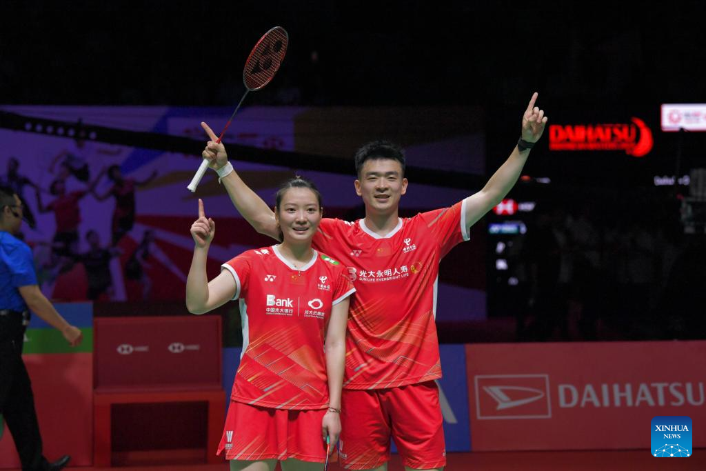 Zheng Siwei (R)/Huang Yaqiong celebrate after winning the mixed doubles final between China's Zheng Siwei/Huang Yaqiong and Japan's Midorikawa Hiroki/Saito Natsu at 2024 Indonesia Masters badminton tournament in Jakarta, Indonesia, Jan. 28, 2024. (Xinhua/Xu Qin)