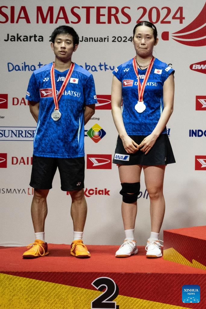 Midorikawa Hiroki (L)/Saito Natsu pose for photos during the awarding ceremony after the mixed doubles final between China's Zheng Siwei/Huang Yaqiong and Japan's Midorikawa Hiroki/Saito Natsu at 2024 Indonesia Masters badminton tournament in Jakarta, Indonesia, Jan. 28, 2024. (Xinhua/Veri Sanovri)