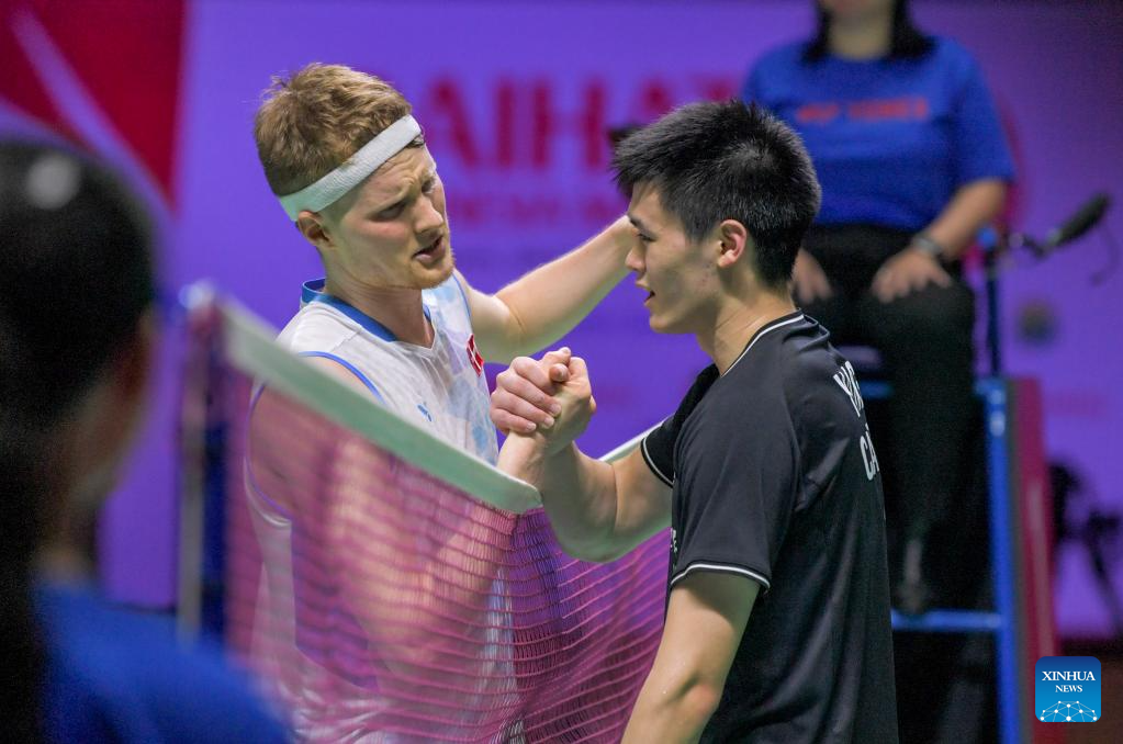 Anders Antonsen (L) greets Brian Yang after the men's singles final match between Denmark's Anders Antonsen and Canada's Brian Yang at 2024 Indonesia Masters badminton tournament in Jakarta, Indonesia, Jan. 28, 2024. (Xinhua/Xu Qin)