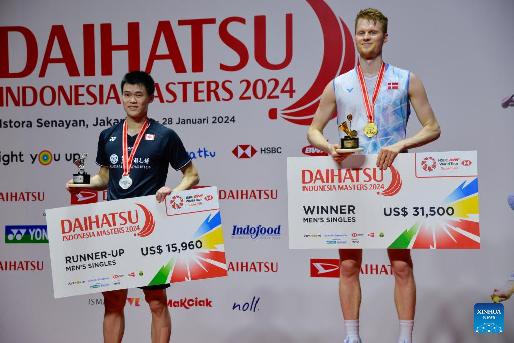 Denmark's Anders Antonsen (R) and Canada's Brian Yang pose on the podium during the awarding ceremony after the men's singles final match at 2024 Indonesia Masters badminton tournament in Jakarta, Indonesia, Jan. 28, 2024. (Xinhua/Xu Qin)