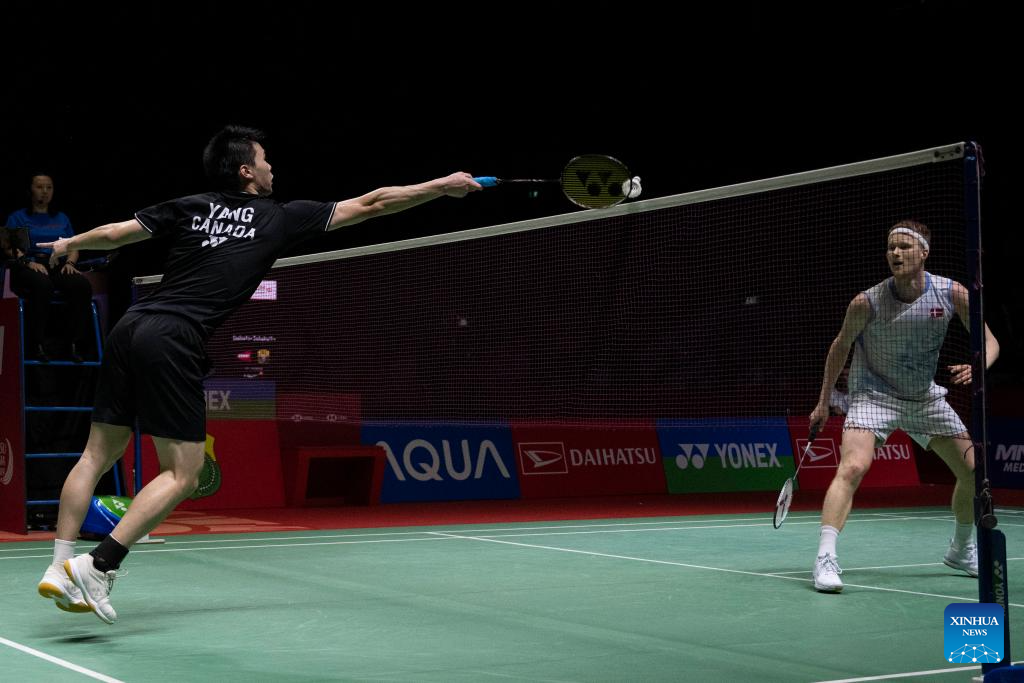 Brian Yang (L) hits a return during the men's singles final match between Denmark's Anders Antonsen and Canada's Brian Yang at 2024 Indonesia Masters badminton tournament in Jakarta, Indonesia, Jan. 28, 2024. (Xinhua/Veri Sanovri)