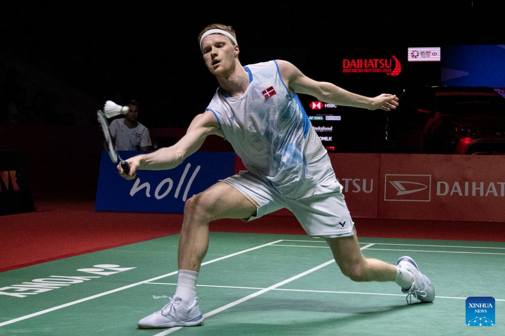 Anders Antonsen hits a return during the men's singles final match between Denmark's Anders Antonsen and Canada's Brian Yang at 2024 Indonesia Masters badminton tournament in Jakarta, Indonesia, Jan. 28, 2024. (Xinhua/Veri Sanovri)