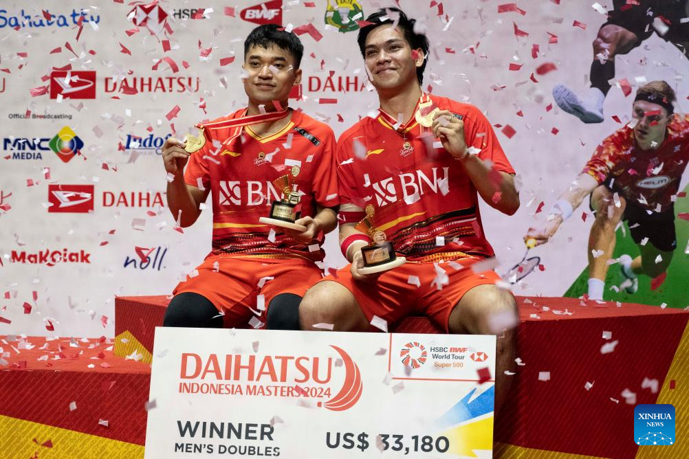 Leo Rolly Carnando (L)/Daniel Marthin pose for photos on the podium during the awarding ceremony after the men's doubles final between Indonesia's Leo Rolly Carnando/Daniel Marthin and Denmark's Kim Astrup/Anders Skaarup Rasmussen at 2024 Indonesia Masters badminton tournament in Jakarta, Indonesia, Jan. 28, 2024. (Xinhua/Veri Sanovri)