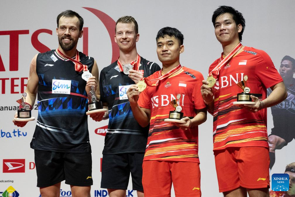 Leo Rolly Carnando (2nd R)/Daniel Marthin (R) of Indonesia and Kim Astrup (2nd L)/Anders Skaarup Rasmussen of Denmark pose for photos on the podium during the awarding ceremony of the men's doubles final at 2024 Indonesia Masters badminton tournament in Jakarta, Indonesia, Jan. 28, 2024. (Xinhua/Veri Sanovri)