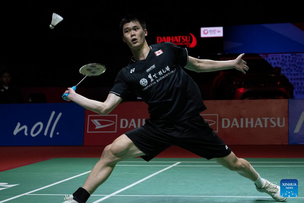 Brian Yang hits a return during the men's singles final match between Denmark's Anders Antonsen and Canada's Brian Yang at 2024 Indonesia Masters badminton tournament in Jakarta, Indonesia, Jan. 28, 2024. (Xinhua/Veri Sanovri)