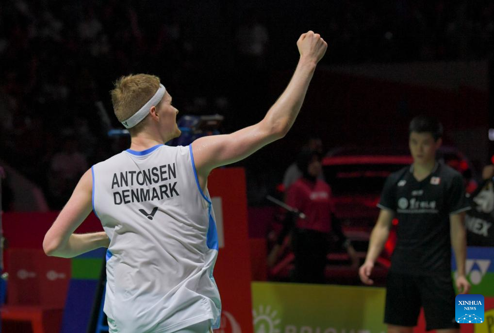 Anders Antonsen reacts after winning the men's singles final match between Denmark's Anders Antonsen and Canada's Brian Yang at 2024 Indonesia Masters badminton tournament in Jakarta, Indonesia, Jan. 28, 2024. (Xinhua/Xu Qin)