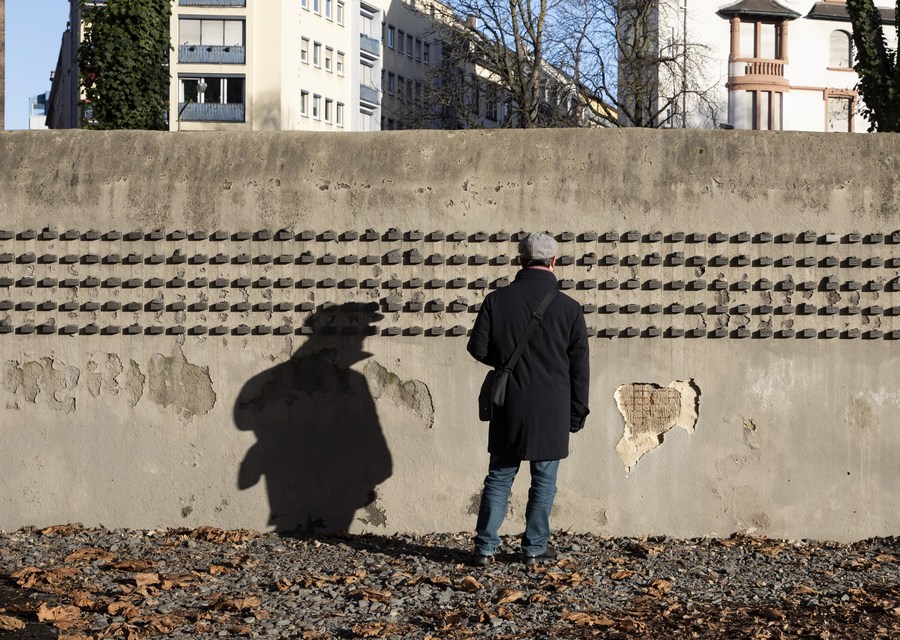 A man looks at the wall of an Old Jewish Cemetery on Battonnstrasse in Frankfurt, Germany, Jan. 27, 2024. (Xinhua/Zhang Fan)