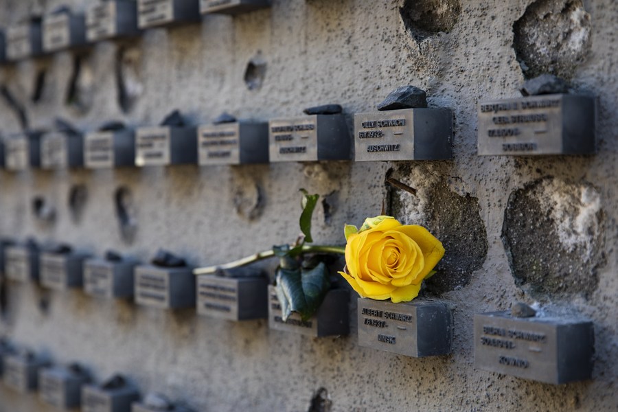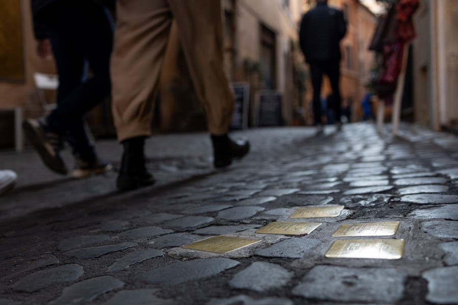 Tourists walk past "stumbling stones," which are small brass plaques engraved with names of Jews killed by the Nazis, at an alley in Rome, Italy, Jan. 27, 2024. (Xinhua/Li Jing)