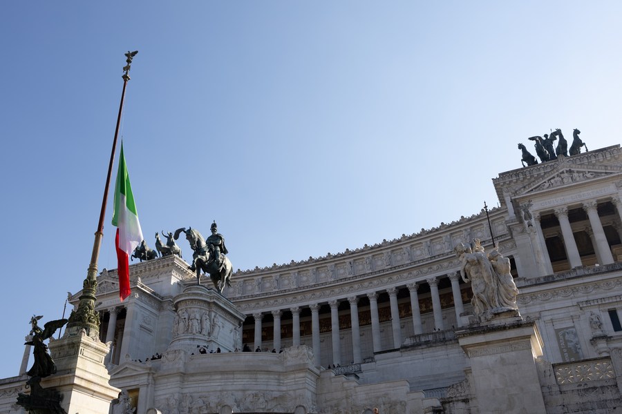 Italian national flag flies at half-mast on the Victor Emmanuel II National Monument in Rome, Italy, Jan. 27, 2024. (Xinhua/Li Jing)