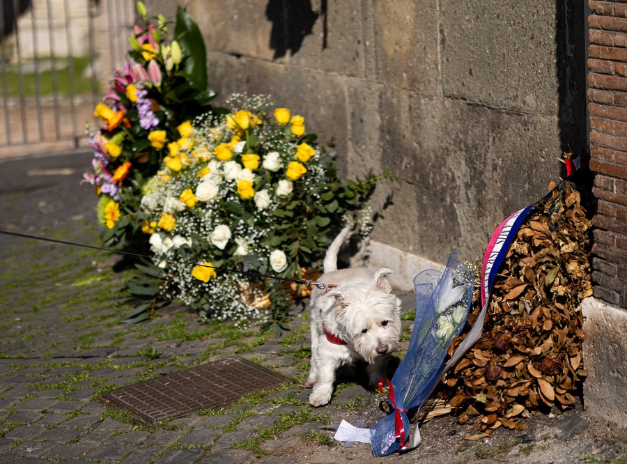 A dog sniffs the bouquets laid in memory of the Holocaust victims in Rome, Italy, Jan. 27, 2024. (Xinhua/Li Jing)