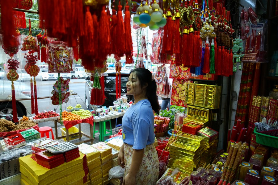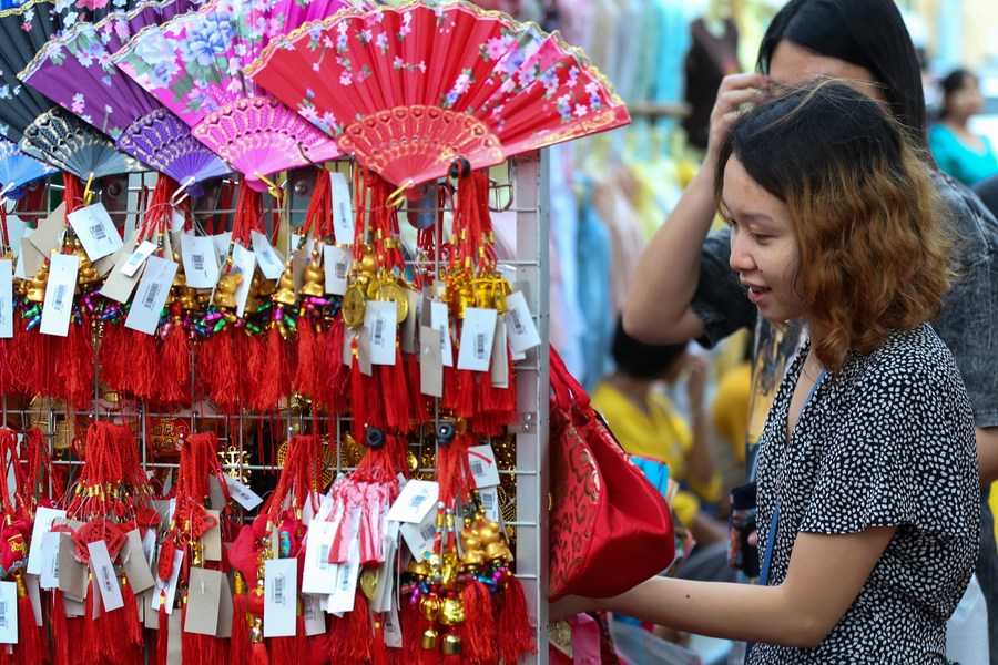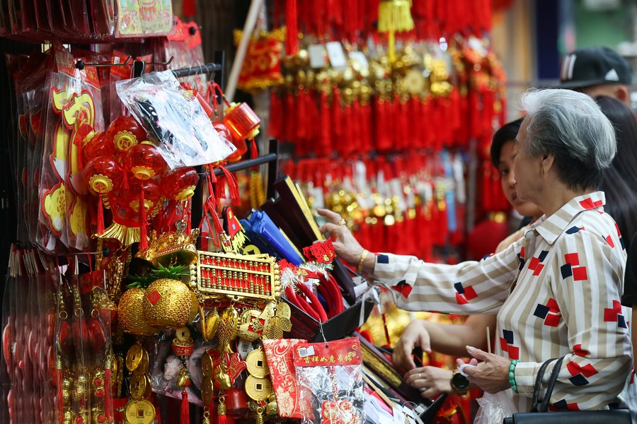 A customer selects decorative items for the upcoming Chinese Lunar New Year at a shop in the Chinatown of Yangon, Myanmar, Jan. 27, 2024. (Xinhua/ Myo Kyaw Soe)