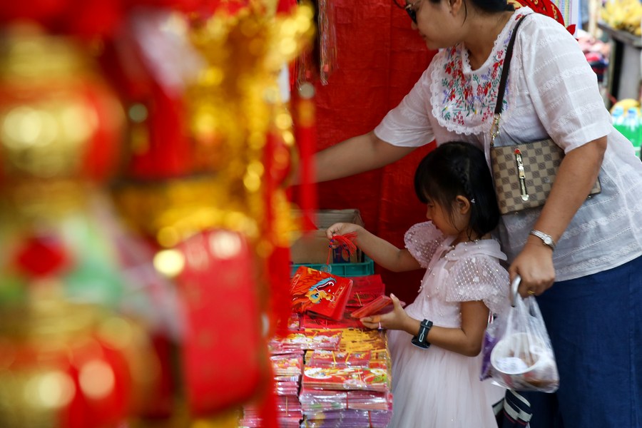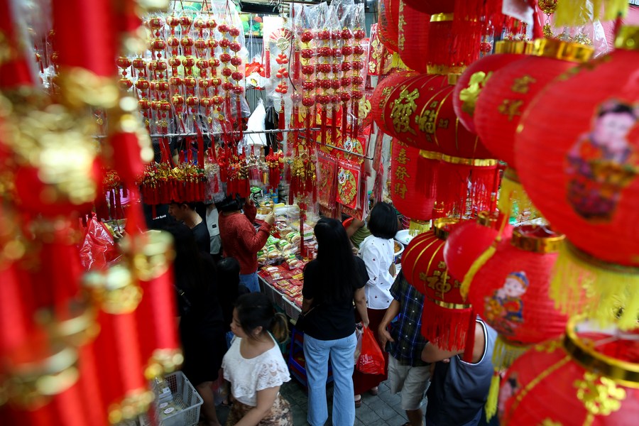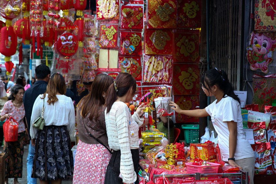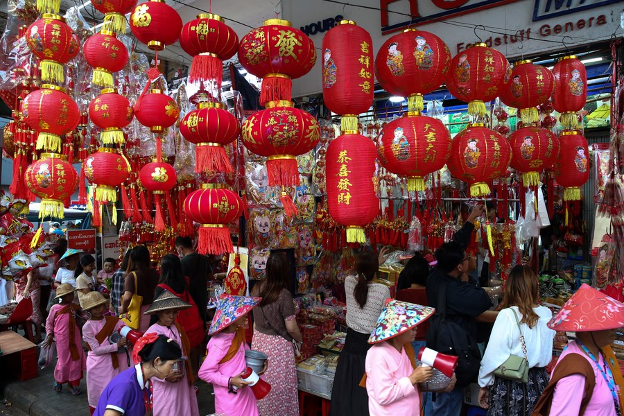 Customers buy decorative items for the upcoming Chinese Lunar New Year at a shop in the Chinatown of Yangon, Myanmar, Jan. 27, 2024. (Xinhua/ Myo Kyaw Soe)